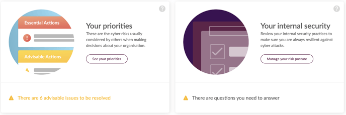 Your Priorities covers the cyber risks usually considered by others when making decisions about your organisation. This could be an insurance provider, investor, or auditor. These risks are also highlighted in the Your Risk Report section as individual risk tiles.