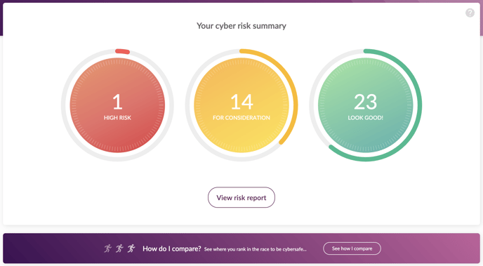 At the top of your dashboard is your Cyber Risk Summary. This highlights the overall number of potential risks that have been discovered by KYND. We break down our risks into easy to understand RED, AMBER, and GREEN categories. For more information on our risk categorisation please see this article: What is a Red, Amber, or Green risk?